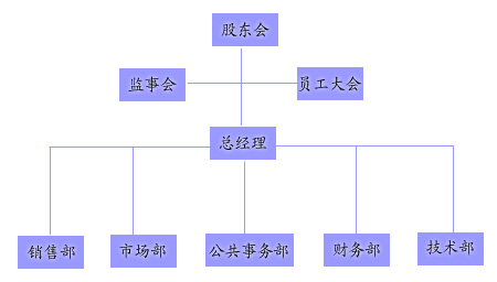 公司设置多个职能部门,各部门各司其责,诚挚合作。股东会:公司最高决策机构,负责运营发展、投资关系。监事会:负责监管公司运营发展。员工大会:负责维护员工利益,协调员工与公司之间关系。公共事务部:管理公司的公共事务,负责企业文化、制度、人事、考评等。财务部:负责公司财务。市场部:负责公司市场策划、广告合作。销售部:负责公司销售事务、业务合作。技术部:负责公司技术资源,研发产品和技术服务。